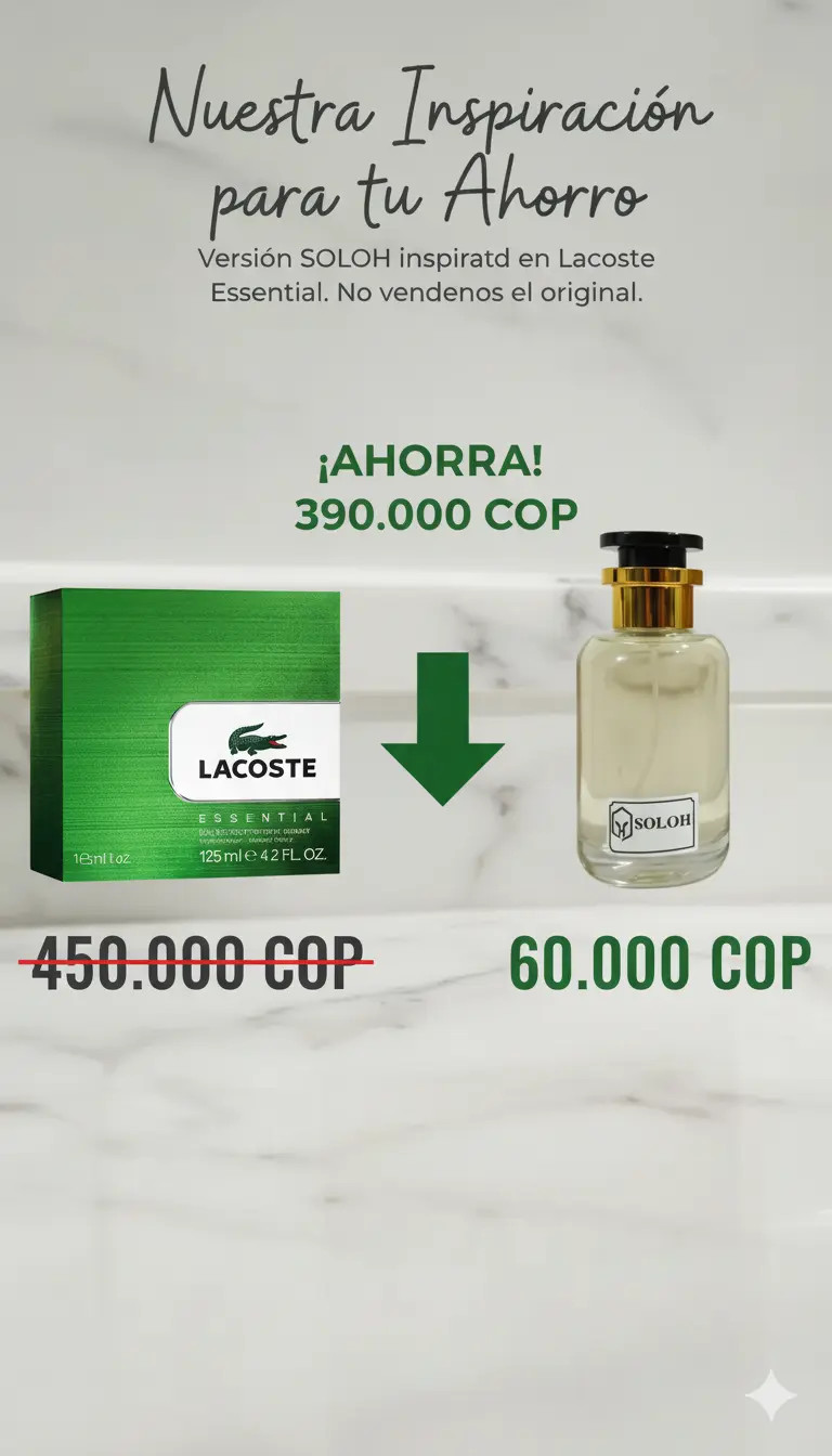 Redescubre la sensación de frescura inagotable con nuestra fragancia inspirada en Lacoste Essential. Creada para el hombre dinámico y espontáneo, esta esencia es un manifiesto de libertad que se adapta a tu ritmo de vida, manteniéndose vibrante y energética desde la mañana hasta la noche.